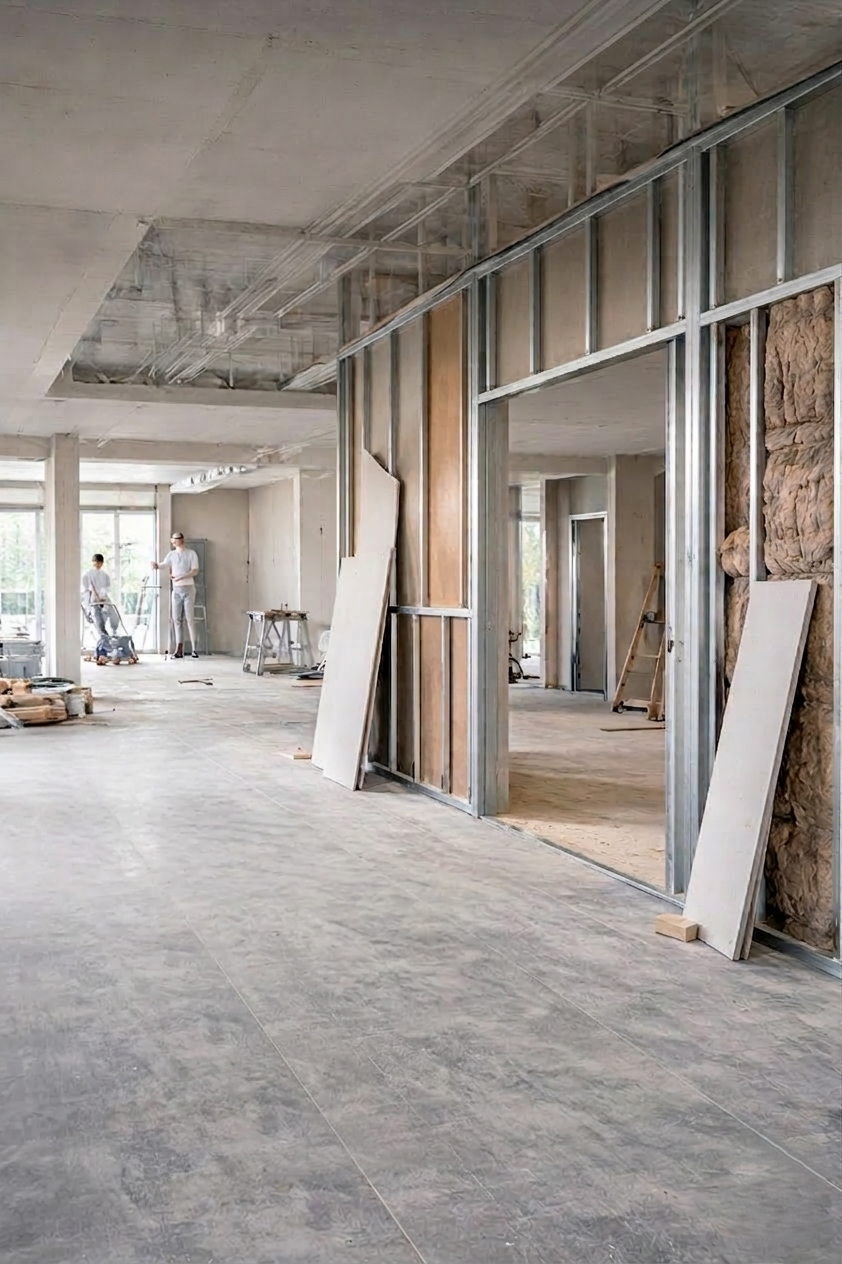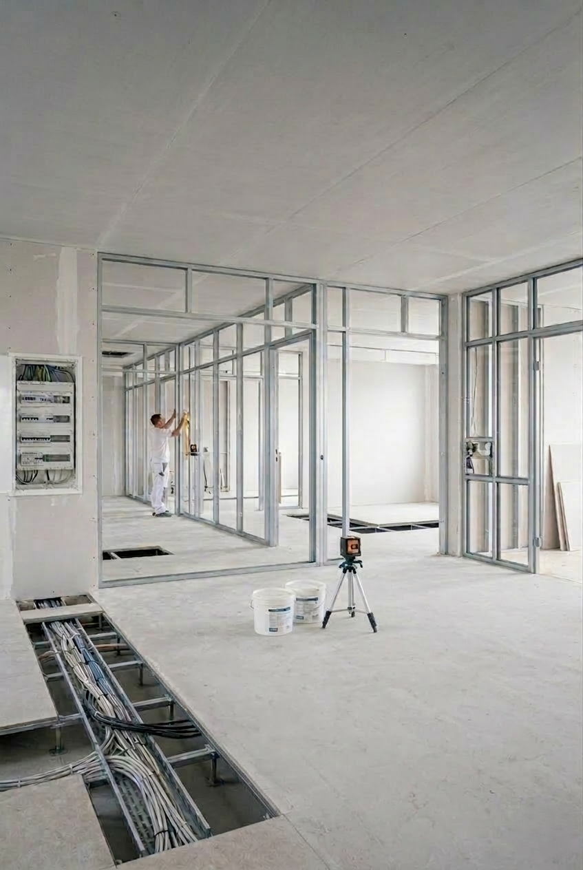 Im modernen Objekt- und Innenausbau sind Trennwandsysteme das zentrale Element für eine effiziente Flächennutzung. Wir realisieren hochwertige Metallständer- und Gipskartonkonstruktionen, die weit über die einfache Raumtrennung hinausgehen. Unsere Systeme erfüllen präzise die baurechtlichen Vorgaben an Brand- und Schallschutz und bieten maximale Flexibilität für spätere Umnutzungen. Durch den Einsatz geprüfter Vorsatzschalen und modularer Trennlösungen schaffen wir stabile, belastbare Strukturen für Büro-, Gewerbe- und Wohnimmobilien. Vertrauen Sie auf zertifizierte Montagequalität, die Termintreue und technische Perfektion vereint.